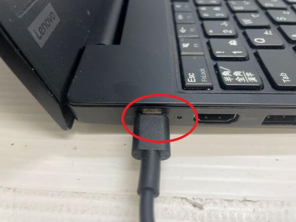 確認するとPCのDCジャックの端子が変形しているため、アダプターのタイプC端子が中まで入らない状況です。