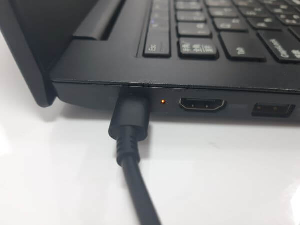アダプタを挿すと充電中のLEDランプがオレンジに点灯します。