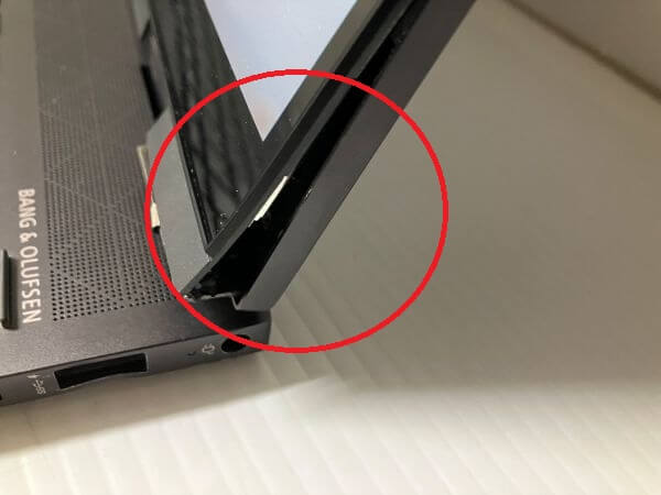 ヒンジ?部分が歪み? 開閉時音が鳴るようになり、無理に閉じようとしたら 液晶画面が破損しました。PCは通常に使用できています。が現状では怖くて開閉できないとのことでご依頼いただきました。 モデルはx360 15-ee0001AUです。