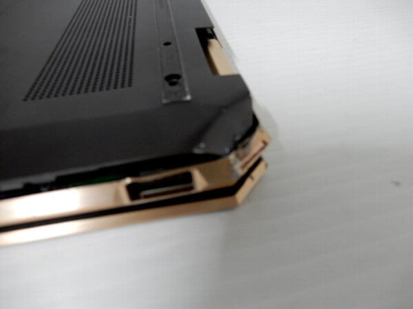 角からパソコンが落下してしまい電源ボタンが陥没して、スイッチが入らなくなった故障です。裏のカバーも変形。 電源ボタン押せないため、起動するか不明な状態でした。 モデルは13-ap0039tu