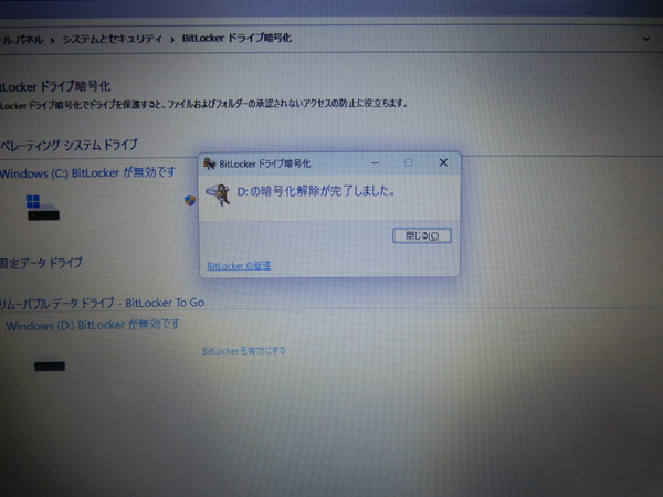 SSDにアクセスすると、Bit Lockerのパスワードがかかった状態です。Bit Lockerが解除できないとデータへのアクセスはできません。