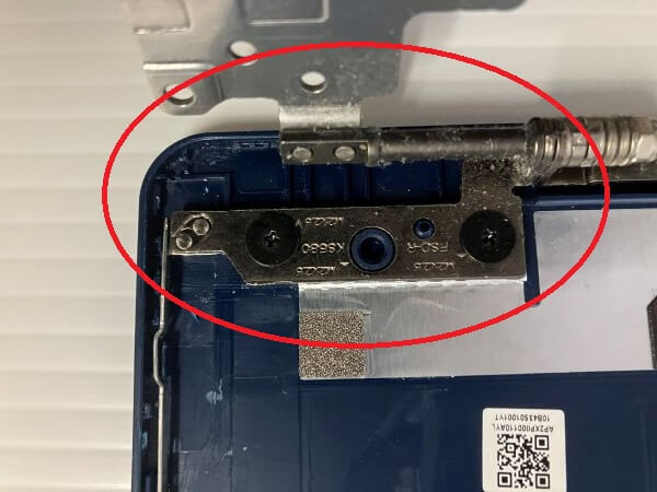 内部を確認すると、内部のヒンジ取り付けネジが破損していました。ヒンジの補修を実施します。