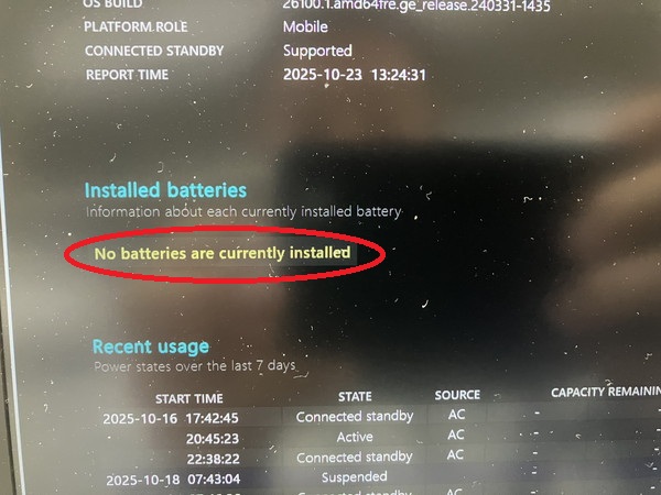 バッテリーレポートではバッテリーが認識されていない表示です。