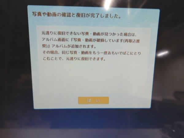 電源ON後、データを復旧表示あり、その後正常に起動・表示された。