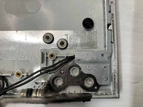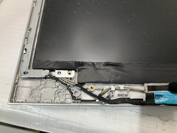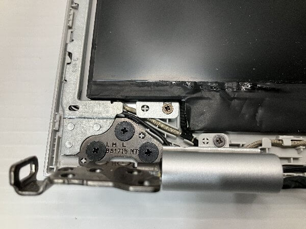 パソコン本体と液晶画面を接続しているヒンジ付近の液晶画面側の外枠が破損しており、画面開閉の度にバキバキと音を立てる状態となっている。液晶画面自体は問題なし